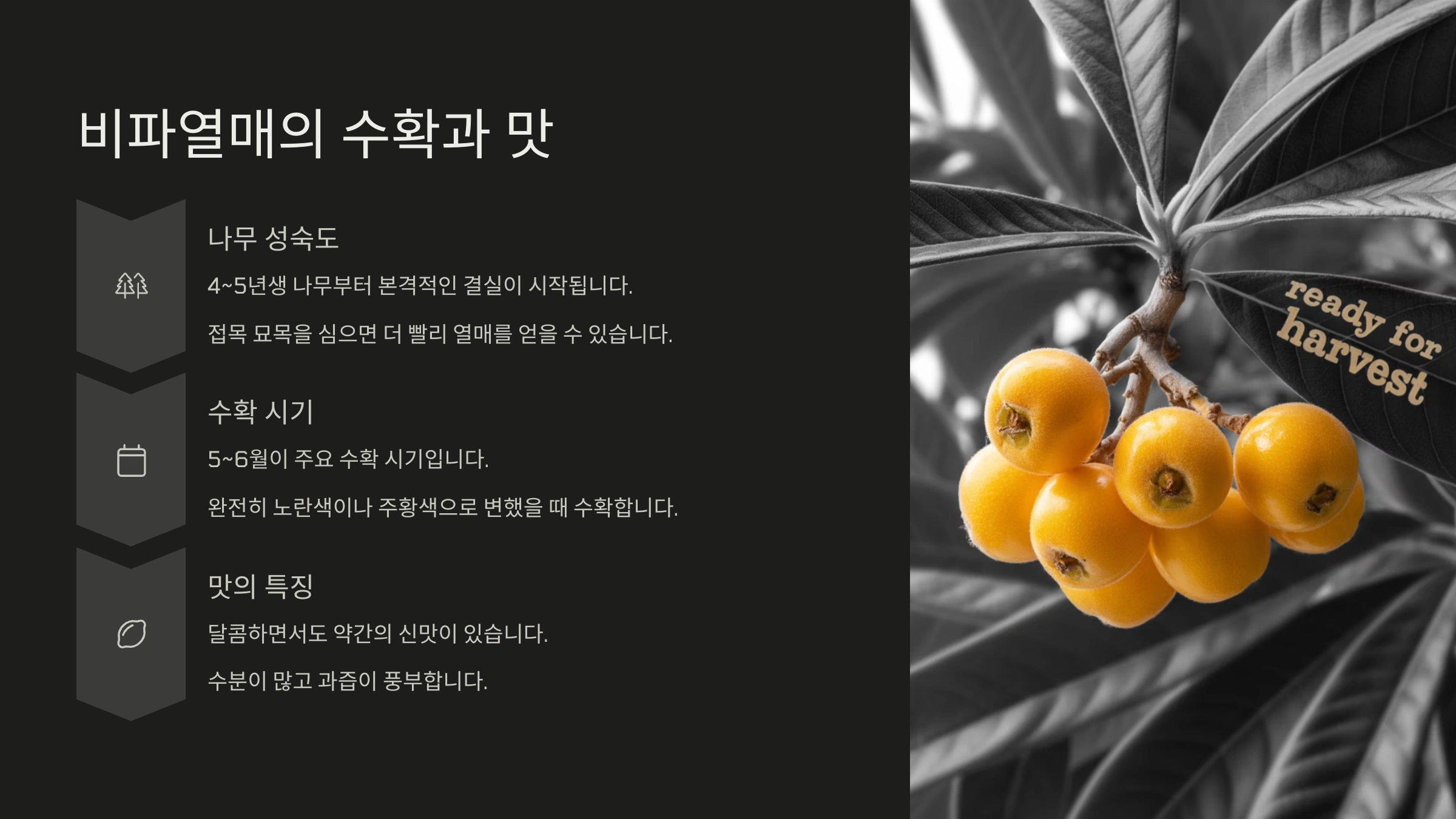 오늘은 비파나무 키우는 법부터 열매와 잎의 효능, 활용법까지 자세히 알아봤어요. 단순한 과일나무를 넘어 우리 가족의 건강까지 챙겨주는 기특한 비파나무, 이번 기회에 한번 도전해보시는 건 어떨까요? 황금빛 열매가 주렁주렁 열리는 기쁨을 꼭 느껴보시길 바라요! 궁금한 점은 댓글로 남겨주세요~ 😊