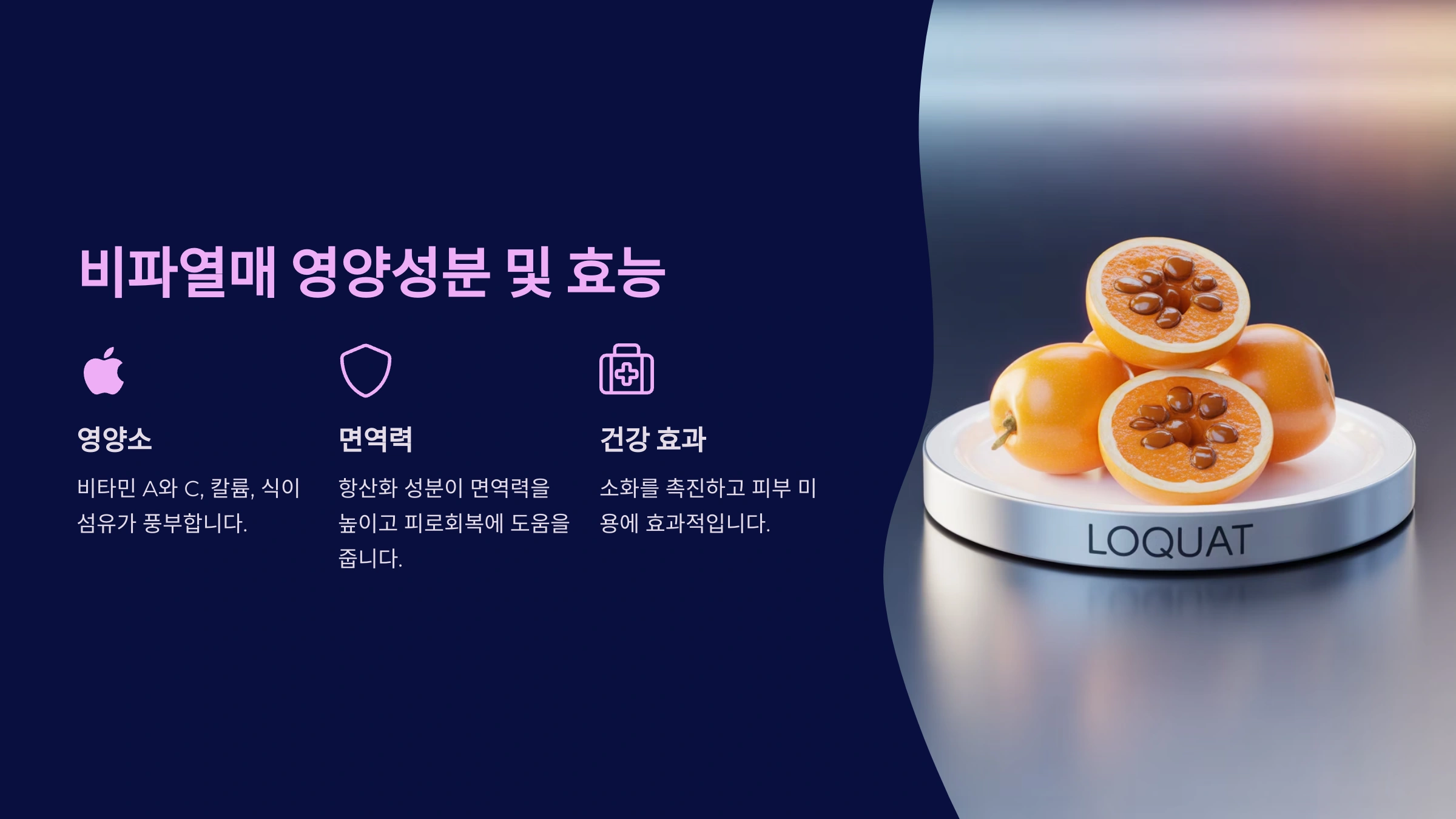 초여름에 맛볼 수 있는 비파열매는 맛도 좋지만 영양도 풍부해요. 비타민 A가 풍부해서 눈 건강에 도움을 주고, 피로 해소와 감기 예방에도 효과적이라고 알려져 있어요. 특히 예로부터 기침이나 가래를 삭이는 데 도움을 준다고 하여 환절기에 인기가 많았답니다.