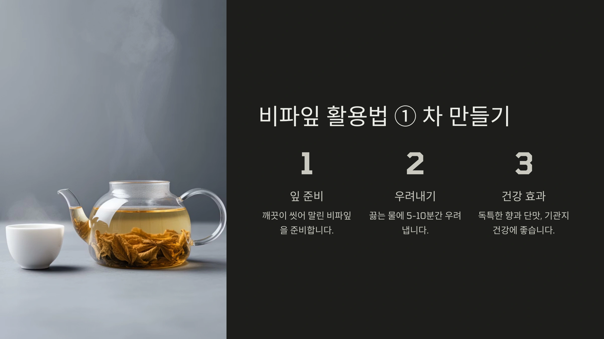 가장 흔한 활용법은 바로 '비파차'로 끓여 마시는 것입니다. 사계절 내내 푸른 잎을 채취할 수 있으니, 그야말로 천연 상비약인 셈이죠.