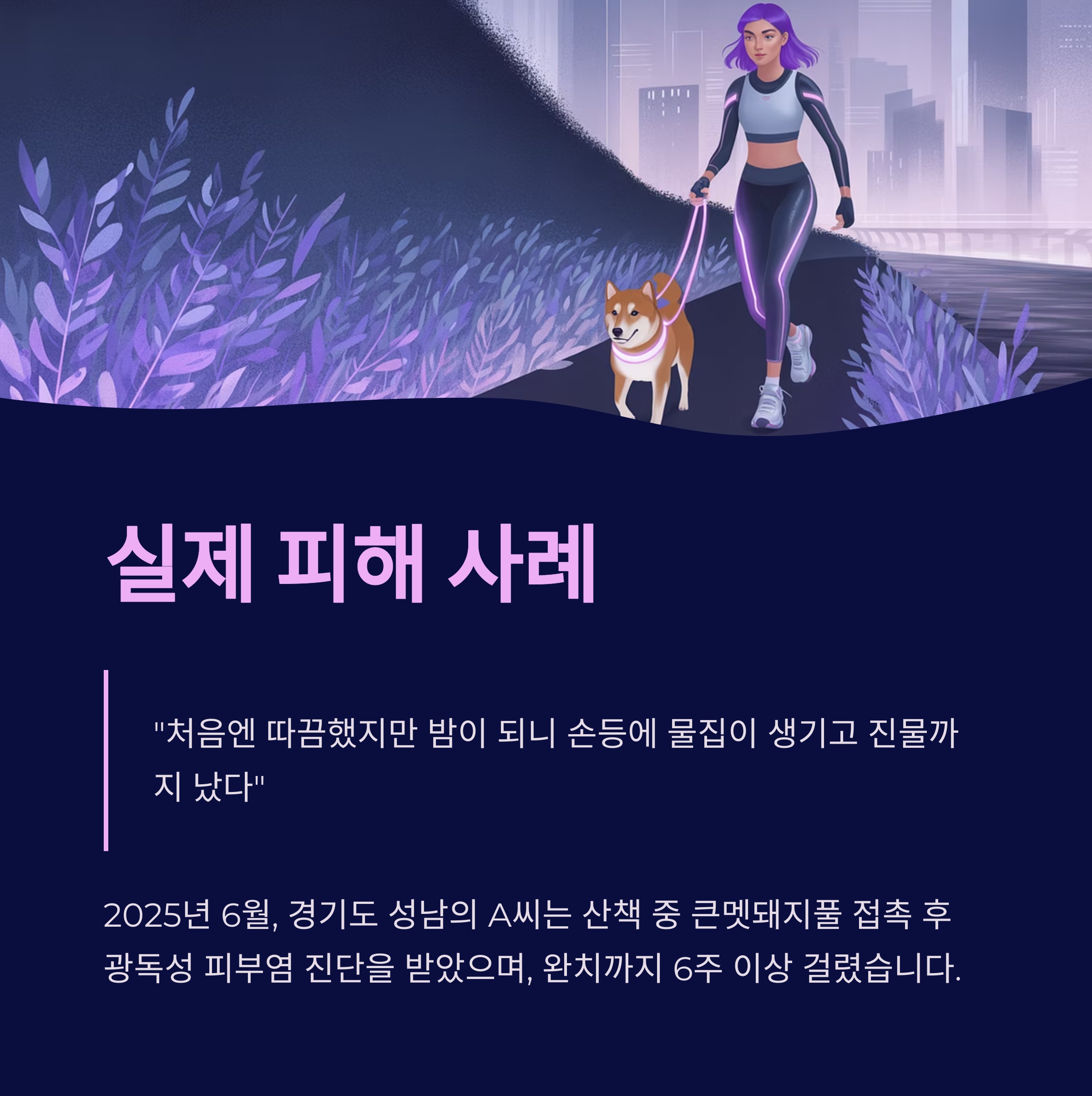 실제 피해 사례: “산책 중 스친 뒤, 손에 물집이 생겼어요”