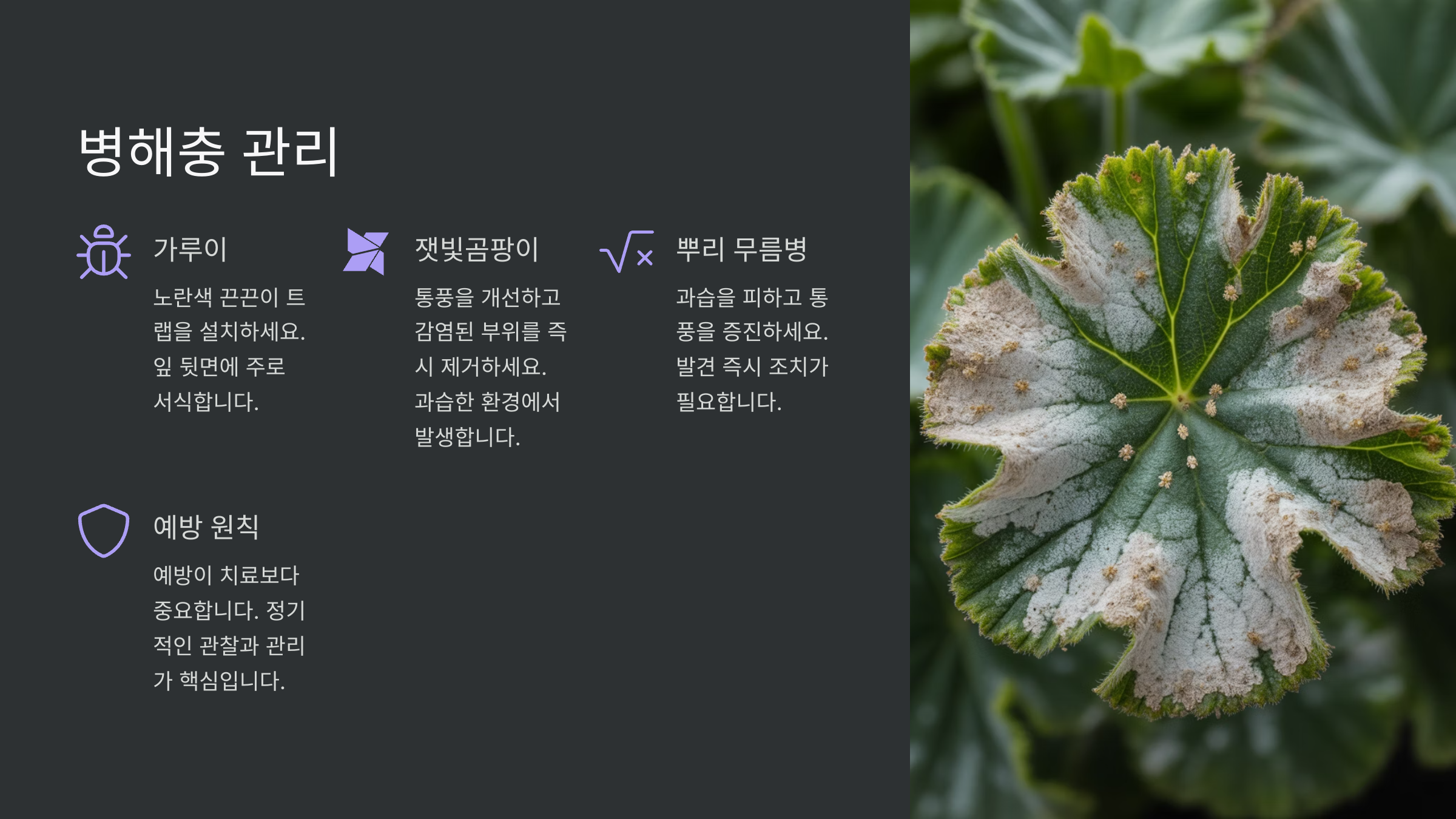 - 통풍 💨: 제라늄에게 통풍은 생명과도 같아요! 통풍이 잘 되지 않으면 과습으로 인한 무름병이나 잿빛곰팡이병 등 병충해에 취약해지기 쉬워요. 창문을 자주 열어 환기시켜주고, 식물들 사이 간격도 적당히 유지해주세요.