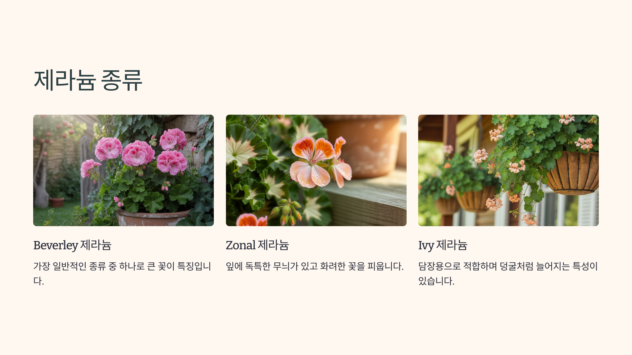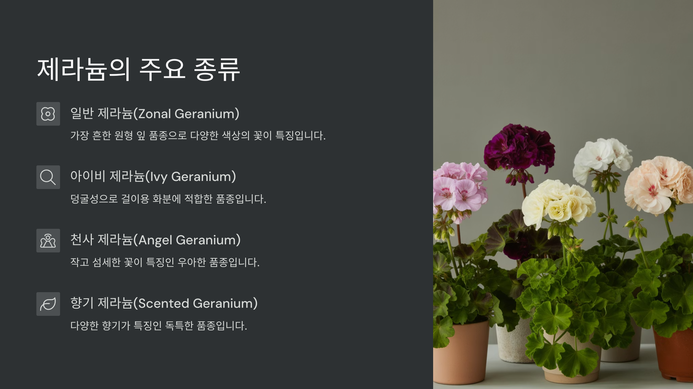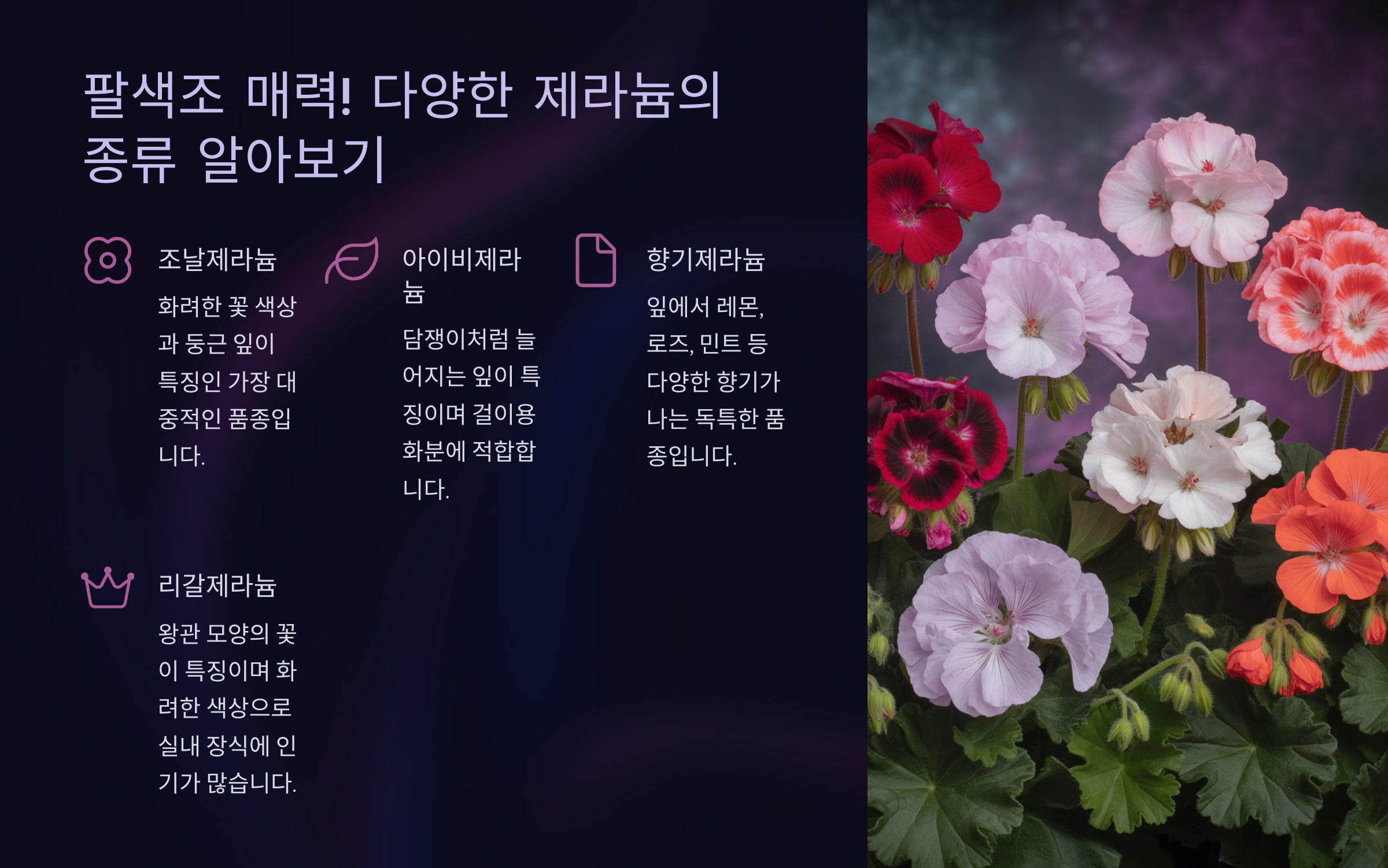 제라늄의 세계는 정말 다채롭답니다! 흔히 볼 수 있는 종류부터 독특한 매력을 가진 아이들까지, 대표적인 제라늄들을 소개해 드릴게요.
