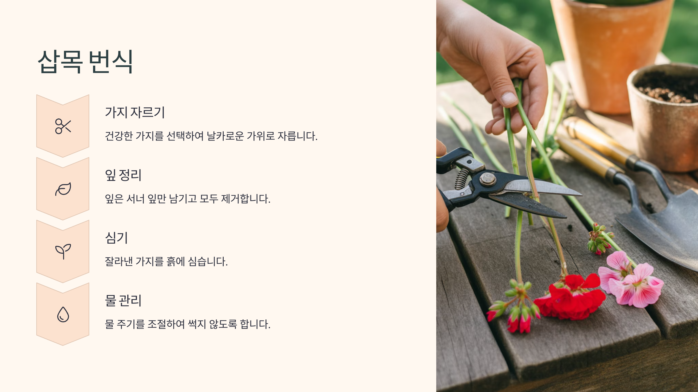 - 도구 소독: 사용하는 칼이나 가위는 깨끗하게 소독해서 감염을 예방해주세요.