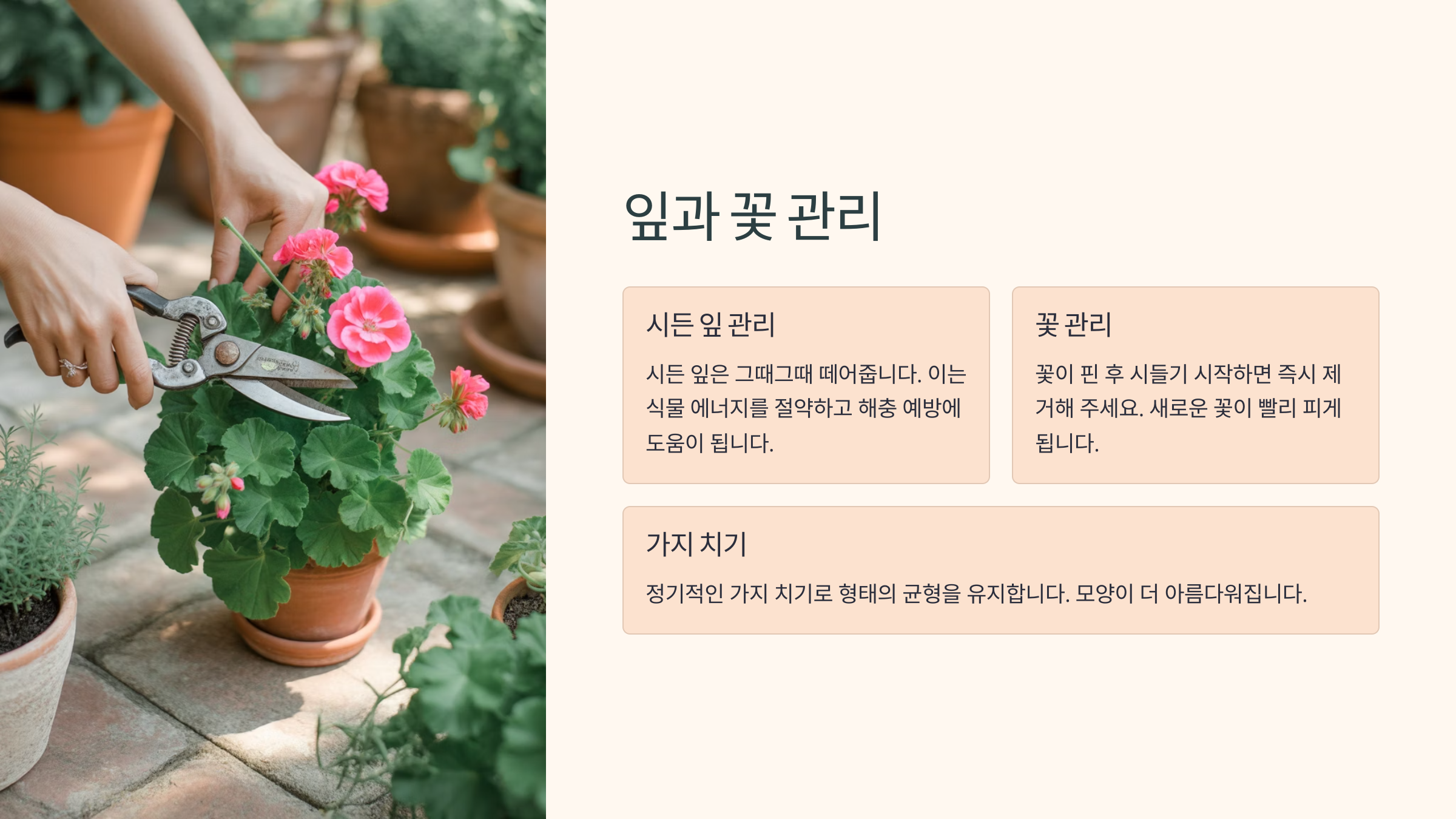제라늄의 아름다운 꽃을 오랫동안, 그리고 풍성하게 보려면 약간의 관리가 필요해요. 바로 꽃대 관리와 순따기랍니다!