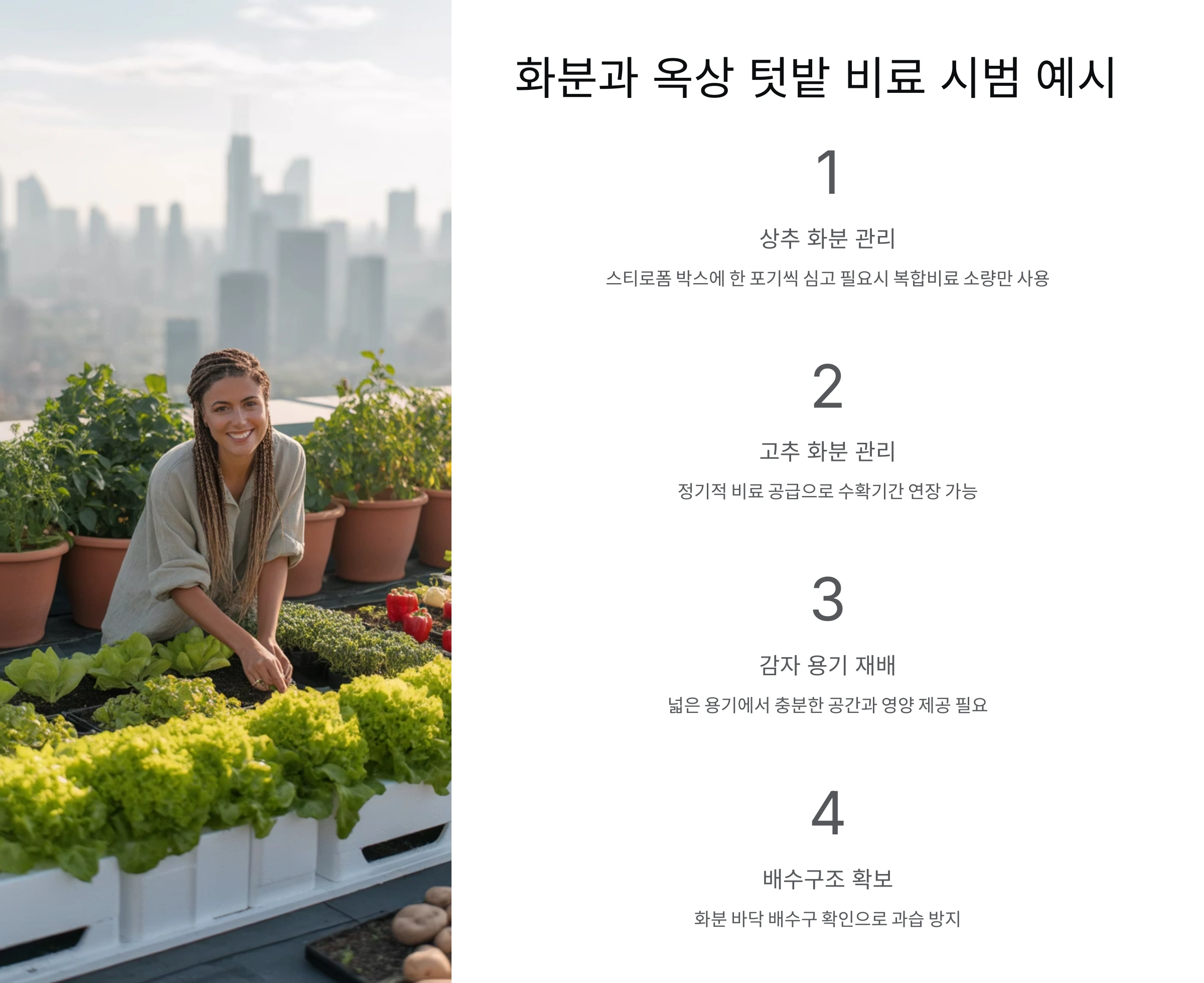 감자는 비교적 병충해에 강한 편이지만, 비료 과잉으로 인해 무름병이나 뿌리썩음병이 생길 수 있어요. 따라서 한 번에 많이 주지 않고 **1회에 적은 양을 여러 번** 나눠 주는 게 핵심이에요. 🌾