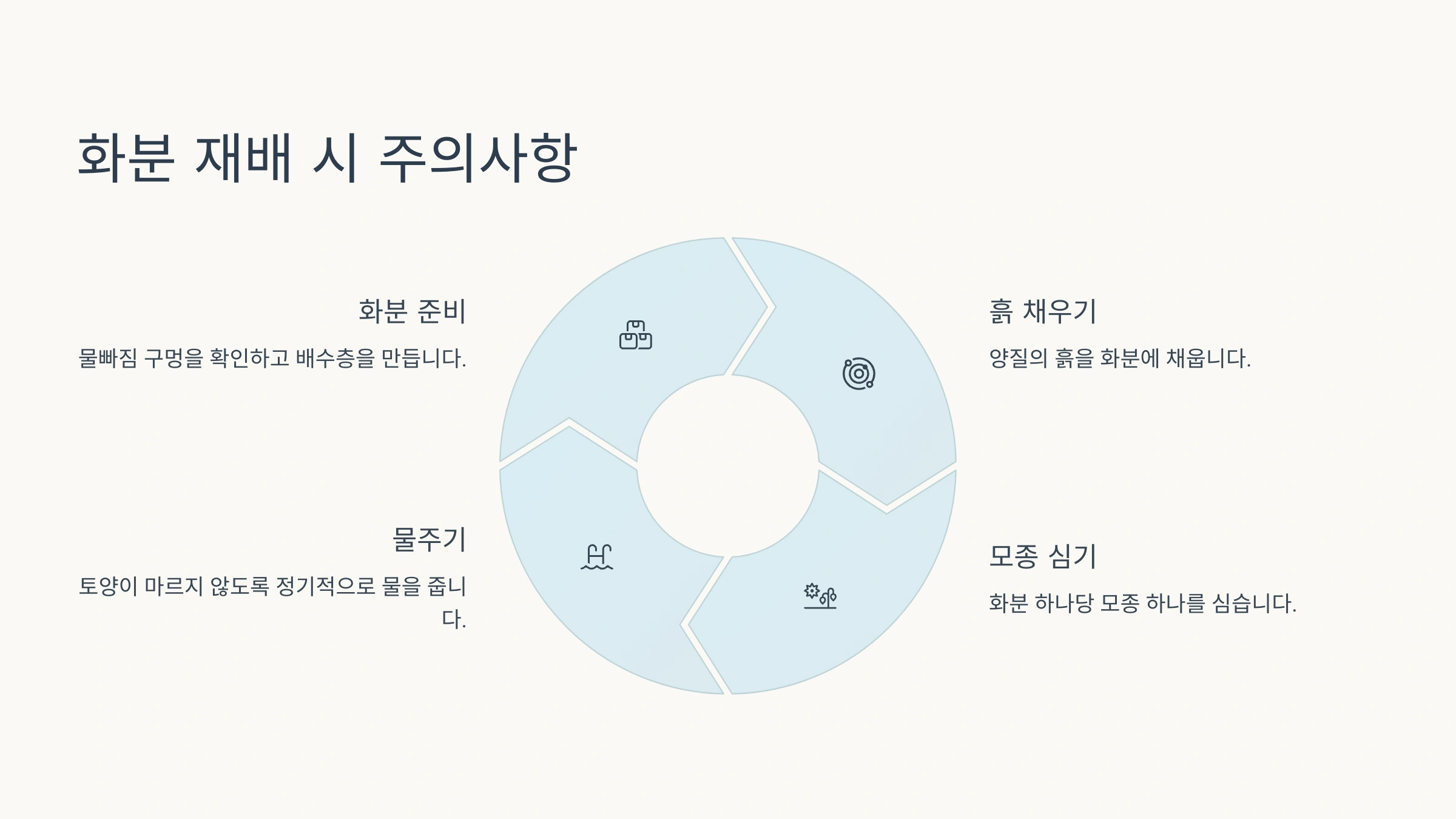 화분 텃밭은 **비료 염류 축적**에 민감해요. 일정 기간이 지나면 흙 속에 비료 성분이 쌓여서 잎 끝이 타거나 노랗게 변하는 현상이 생겨요. 이럴 땐 깨끗한 물로 흙을 흘려주는 ‘수세(洗水)’를 1~2주에 한 번 정도 해주면 좋아요.