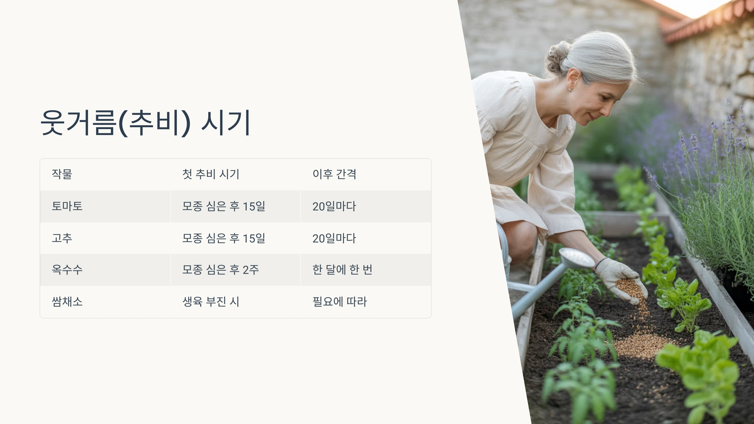 | 수확 전후 | 복합비료/액비 | 소량 흩뿌림 | 2~3주 간격 |