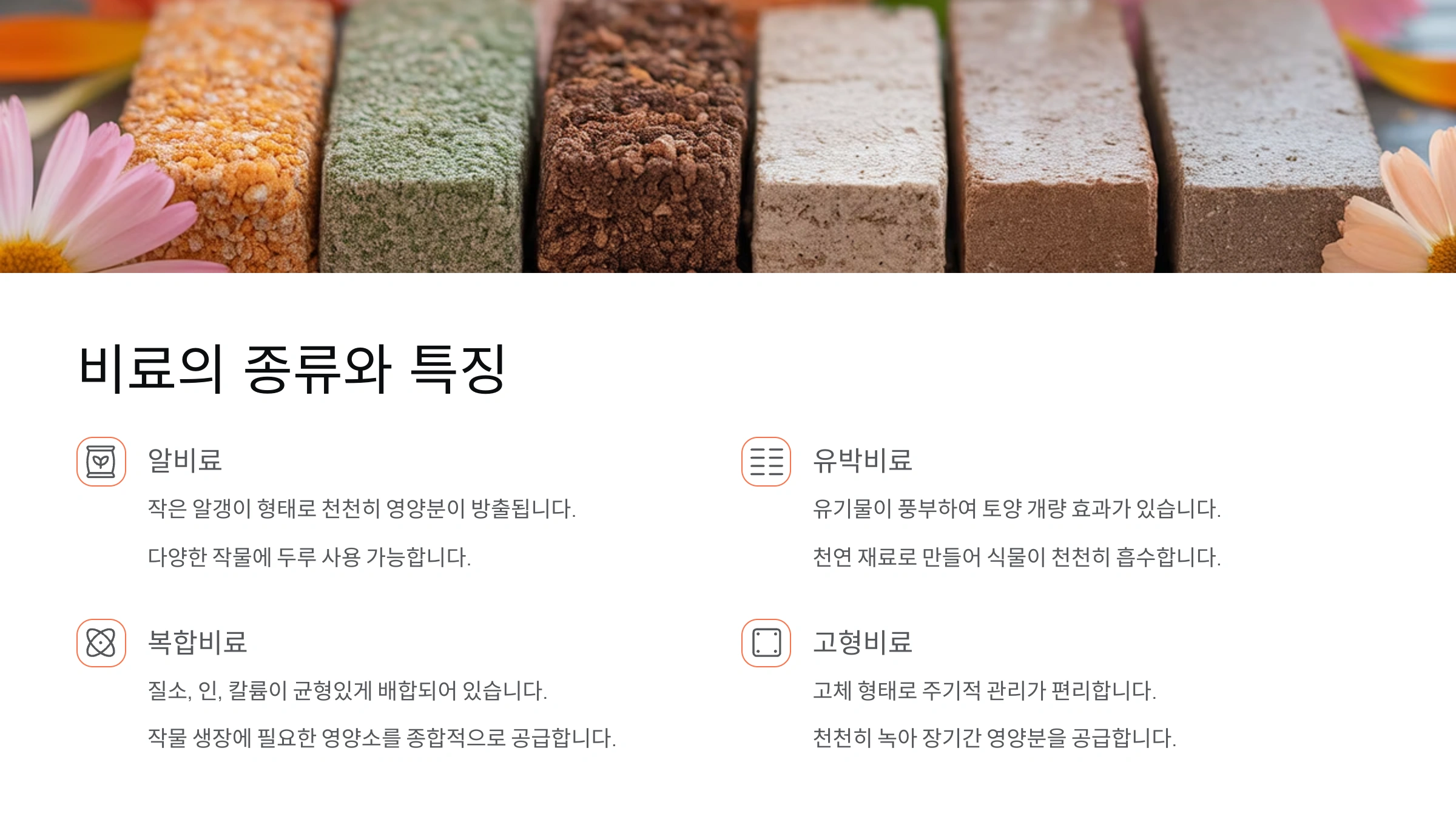 | 비료 종류 | 주요 성분 | 사용 작물 | 특징 |