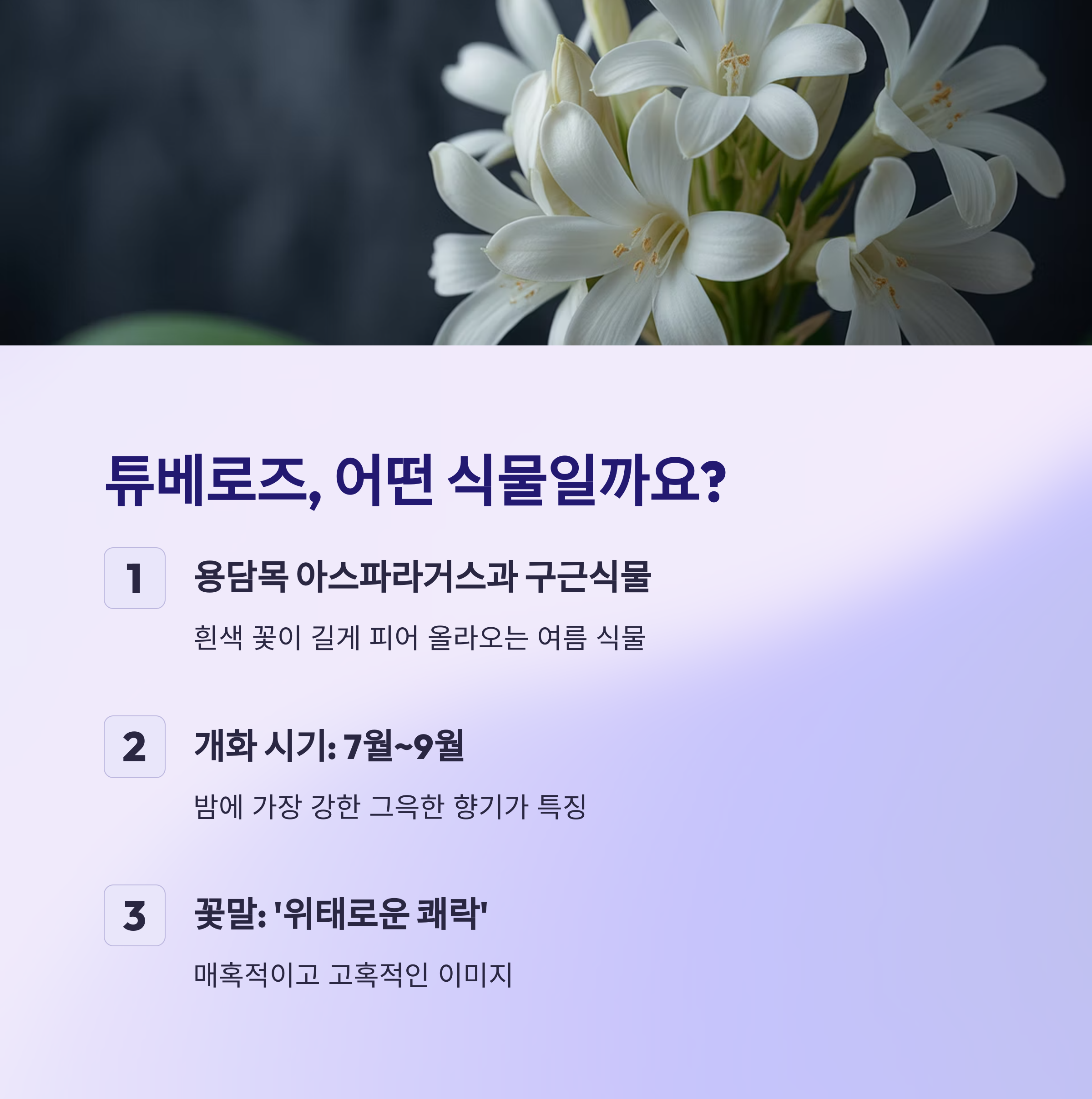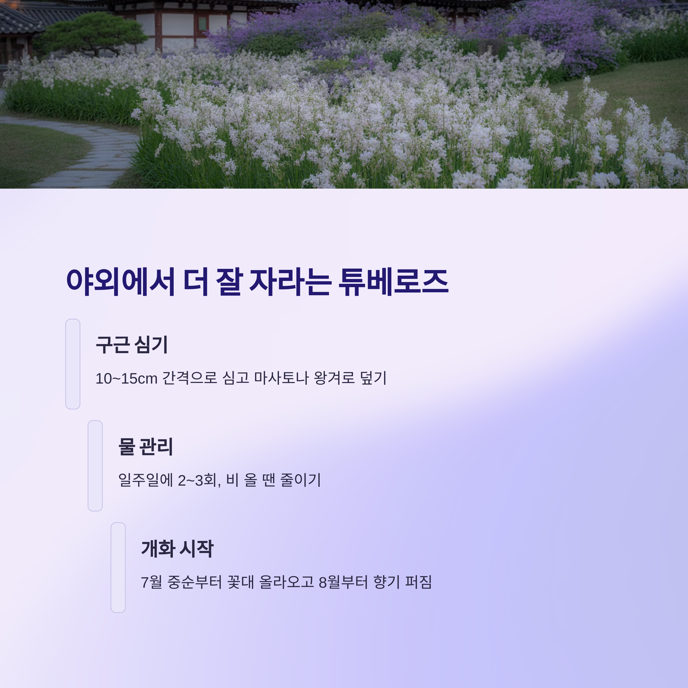 튜베로즈(Tuberose)는 '밤의 여왕'이라 불릴 만큼 은은하고 깊은 향기로 많은 사람들에게 사랑받는 여름 구근식물입니다. 특히 꽃이 피는 밤이면 그윽한 향이 정원을 가득 채워, 향수 원료로도 널리 사용되죠. 하지만 생소한 구근식물이라 어떻게 심고, 어떻게 관리해야 할지 모르겠다는 분들도 많으실 거예요. 이 글에서는 2025년 여름 기준으로 튜베로즈를 건강하게 잘 키우는 방법을 단계별로 안내드립니다. 초보자도 향기로운 튜베로즈 정원을 만들 수 있도록, 실내 화분부터 마당 화단까지 모두 포함했어요.