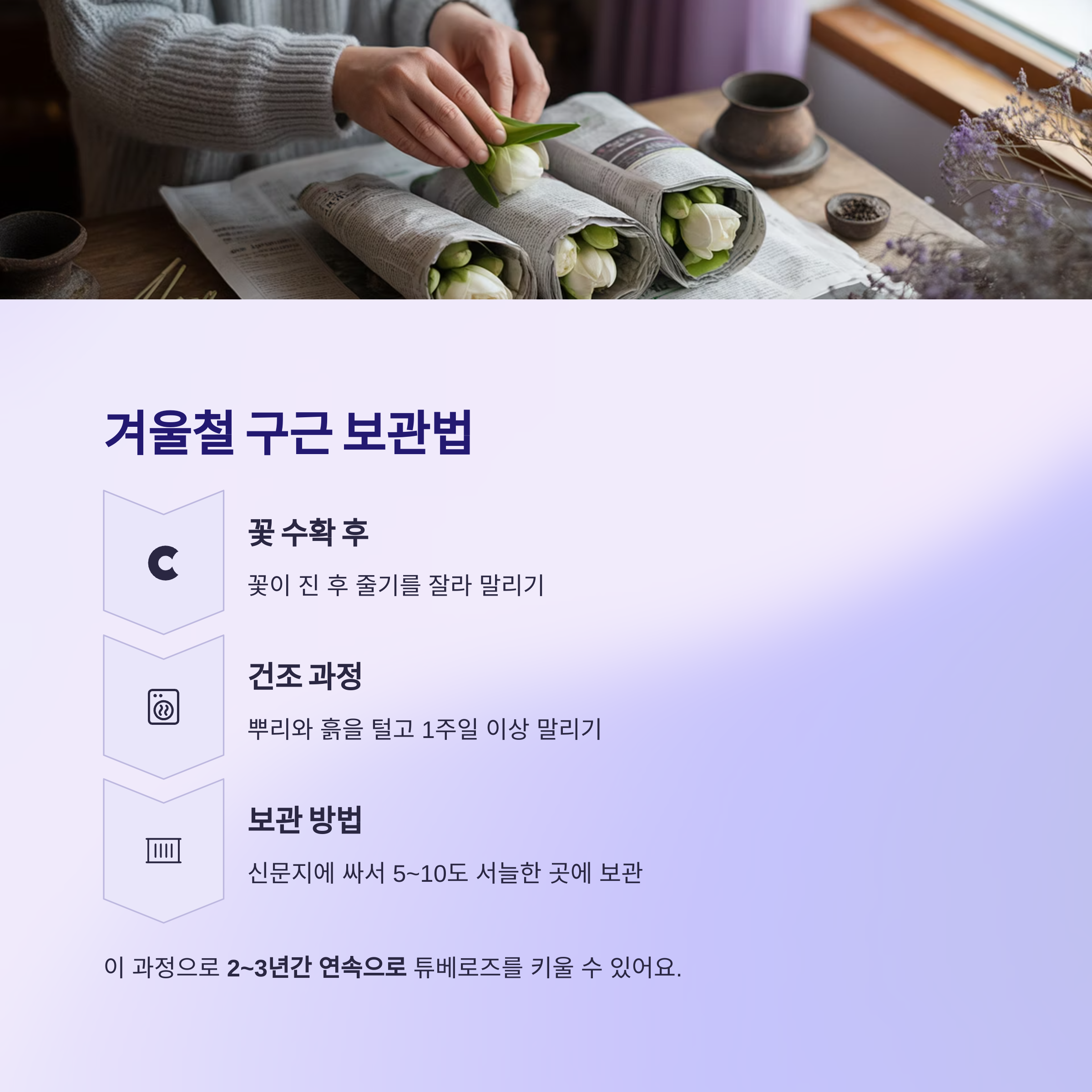 튜베로즈는 내한성이 매우 약한 식물로, 겨울에는 반드시 구근을 캐내어 보관해야 합니다.