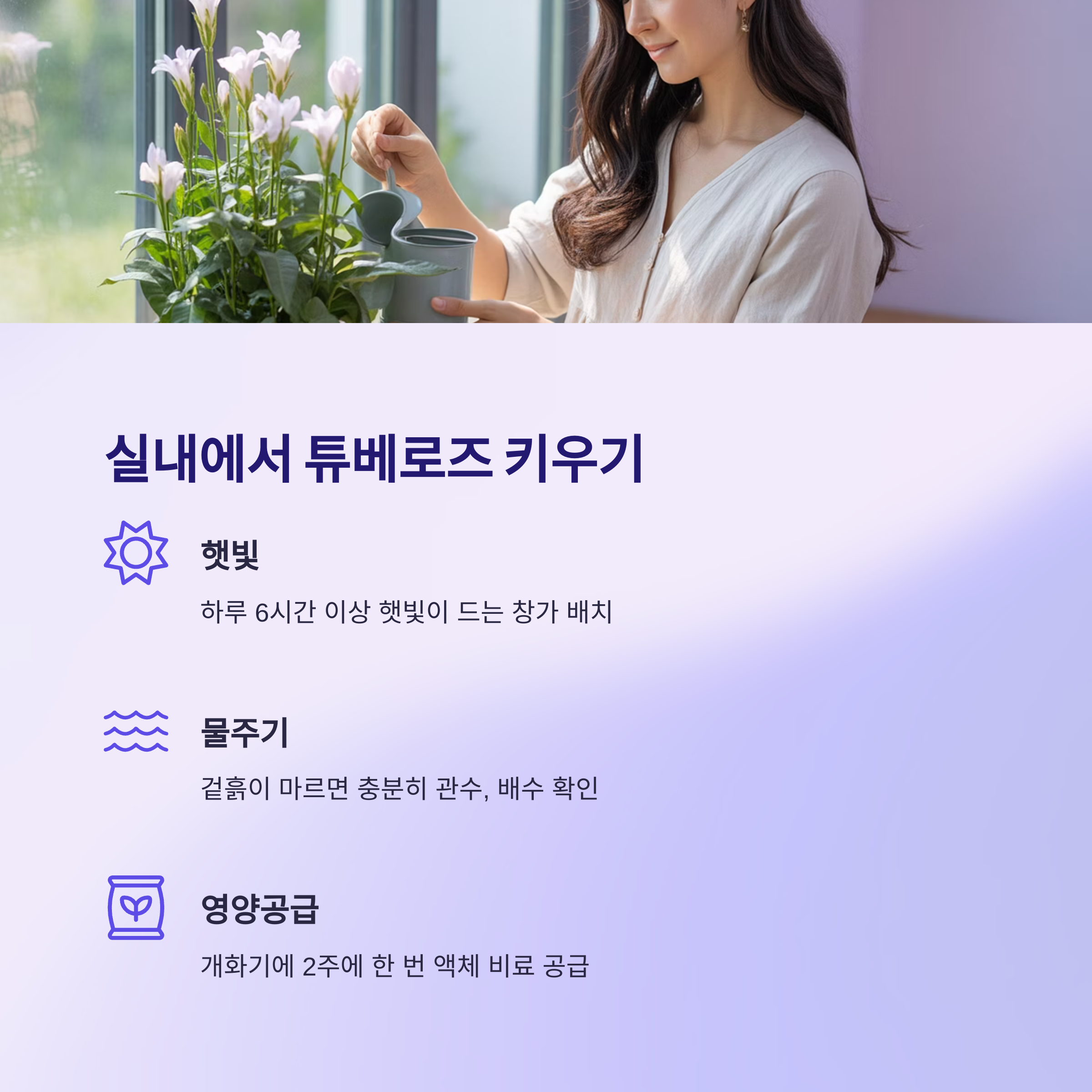 실내에서 튜베로즈를 키우려면, 햇빛이 6시간 이상 드는 창가가 가장 좋습니다.