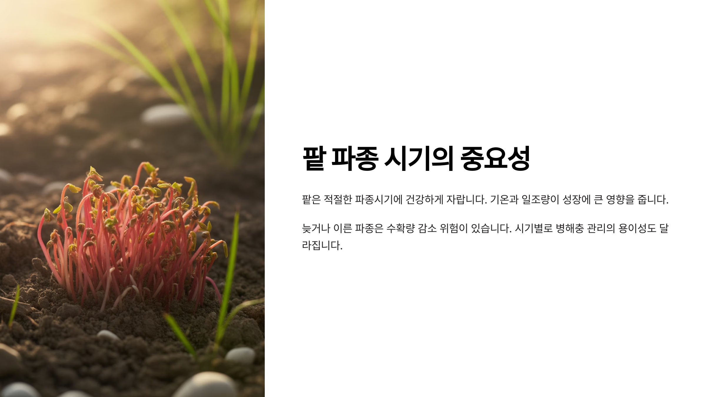 - 너무 늦은 파종의 문제점: 반대로 너무 늦게 심으면 팥이 제대로 여물기도 전에 첫서리를 맞을 수 있습니다. 팥은 저온에 약해서 서리를 맞으면 품질이 떨어지고 수확량이 크게 줄어들게 돼요.