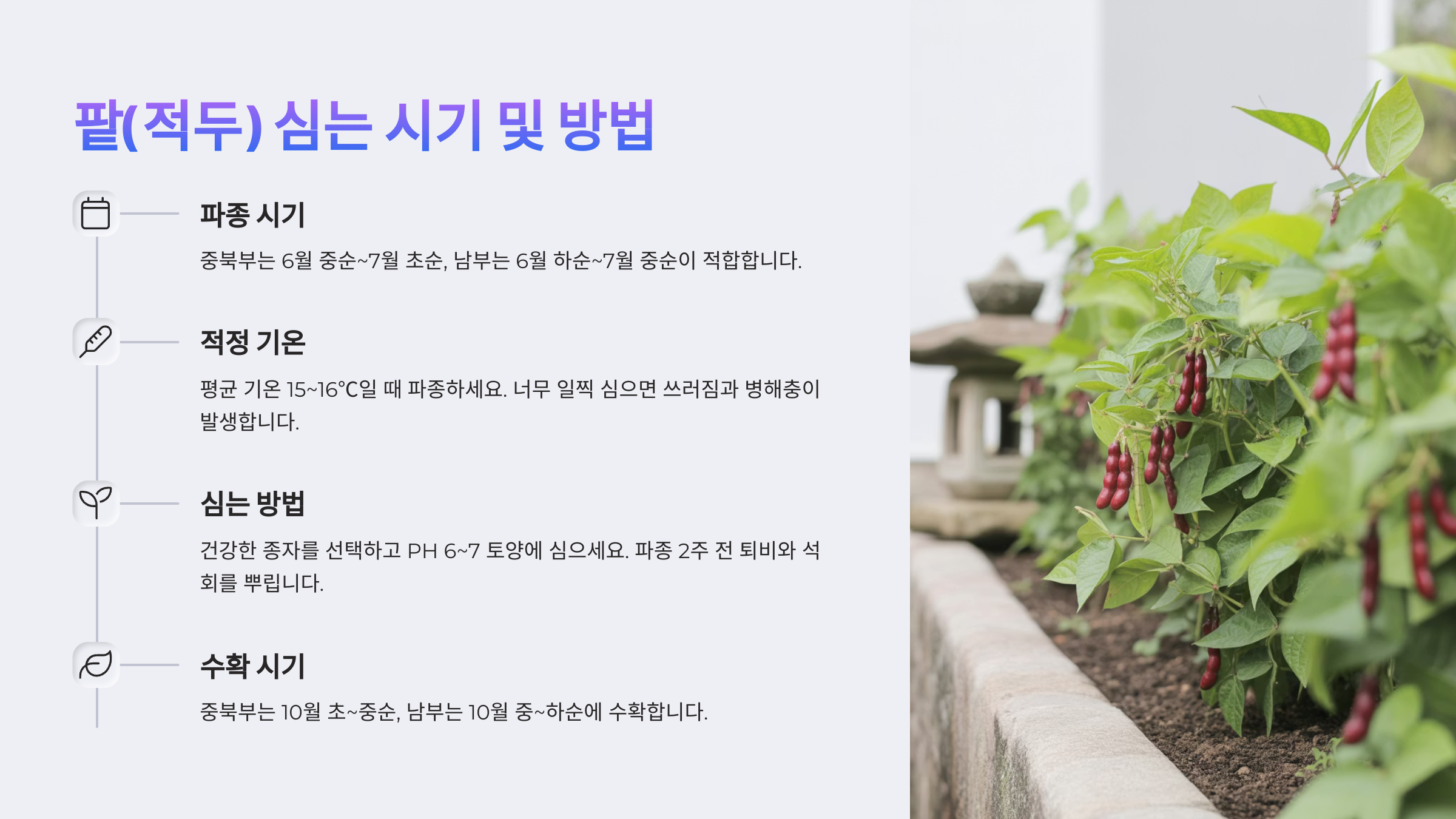 | 팥 농사 초보 필독! 팥 심는 시기, 파종시기와 재배 방법, 전문가 꿀팁 총정리 (0) | 2025.06.17 |