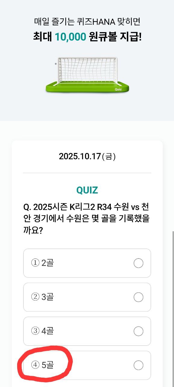 - ‘축구Play’ 메뉴 안의 ‘퀴즈HANA’ 또는 오늘의 퀴즈를 선택합니다.