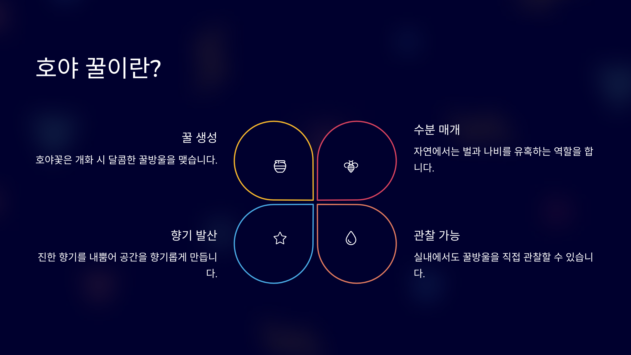 호야꽃은 달콤한 향과 꿀을 만들어내는 식물로도 유명해요. 꽃 중앙에서 작은 꿀방울이 맺혀 벌이나 나비들을 유혹하는데요, 이 꿀은 호야꽃의 건강한 개화를 돕는 자연의 선물이기도 해요.