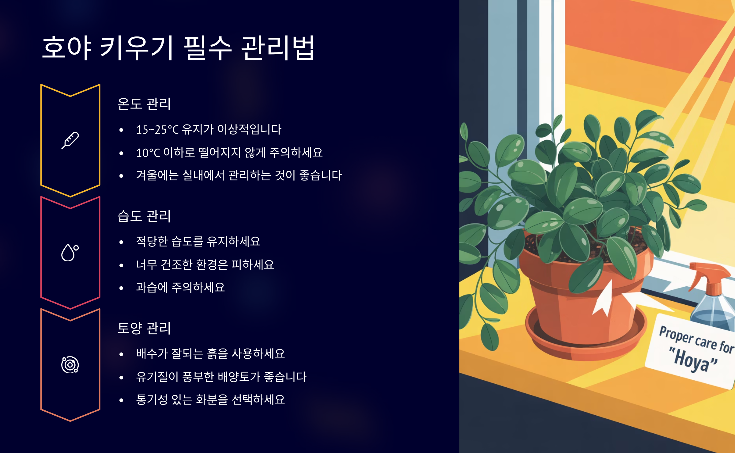 위의 체크리스트를 참고해서 환경을 맞춰주면, 예쁜 호야꽃을 오래도록 즐길 수 있을 거예요! 🌸