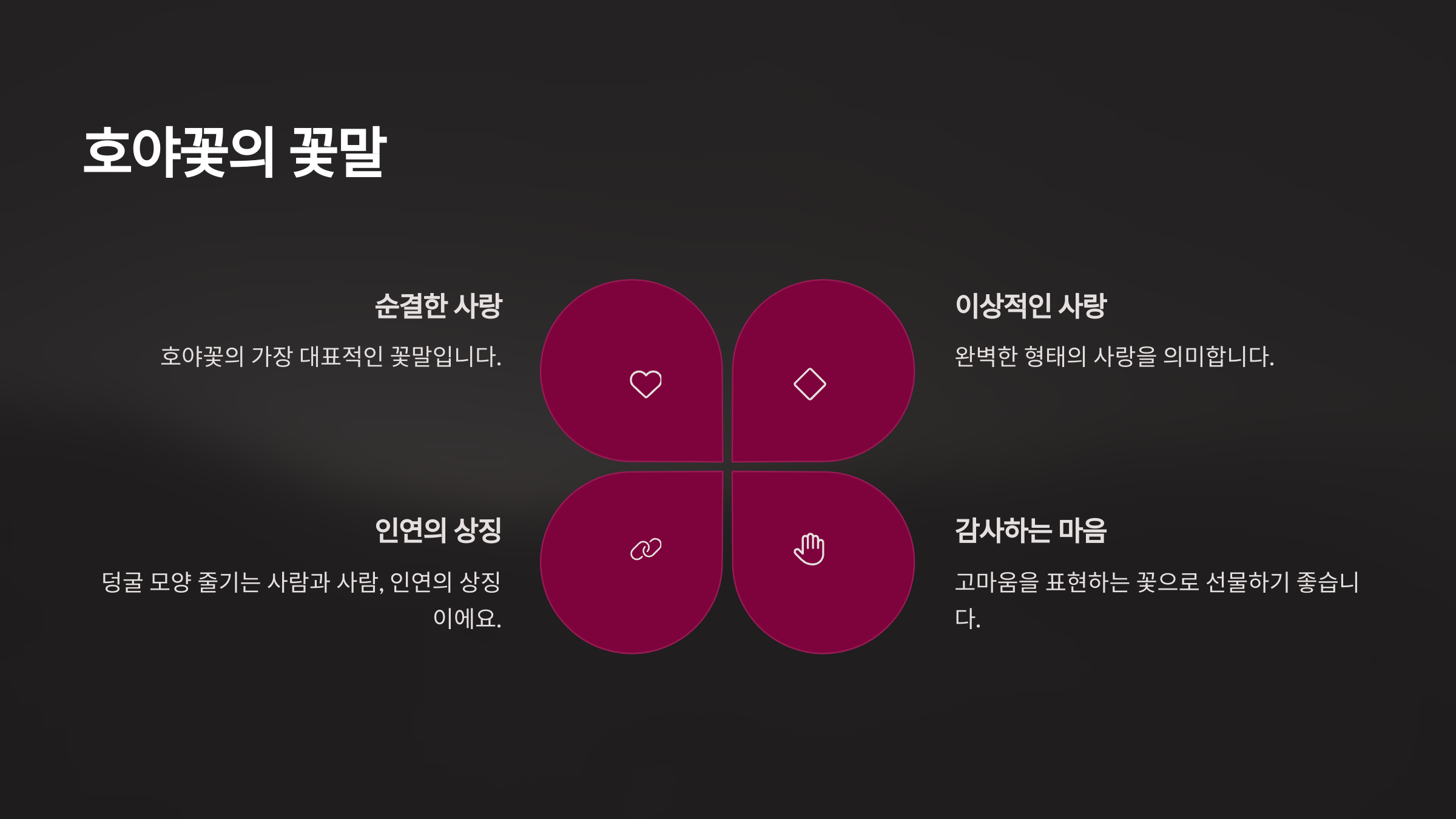 호야꽃의 꽃말은 '사랑의 결속', '행복한 사랑', 그리고 '믿음'이라고 해요. 이 꽃은 사랑의 의미를 담고 있어서 연인이나 가족에게 선물하기에도 좋답니다.