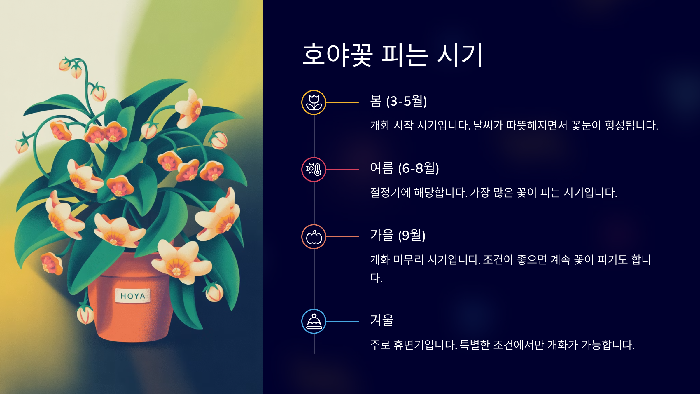계절마다 호야꽃의 꽃피우기가 조금씩 다르니까, 표를 참고해서 환경을 맞춰주면 풍성한 꽃을 즐길 수 있어요! 🌹