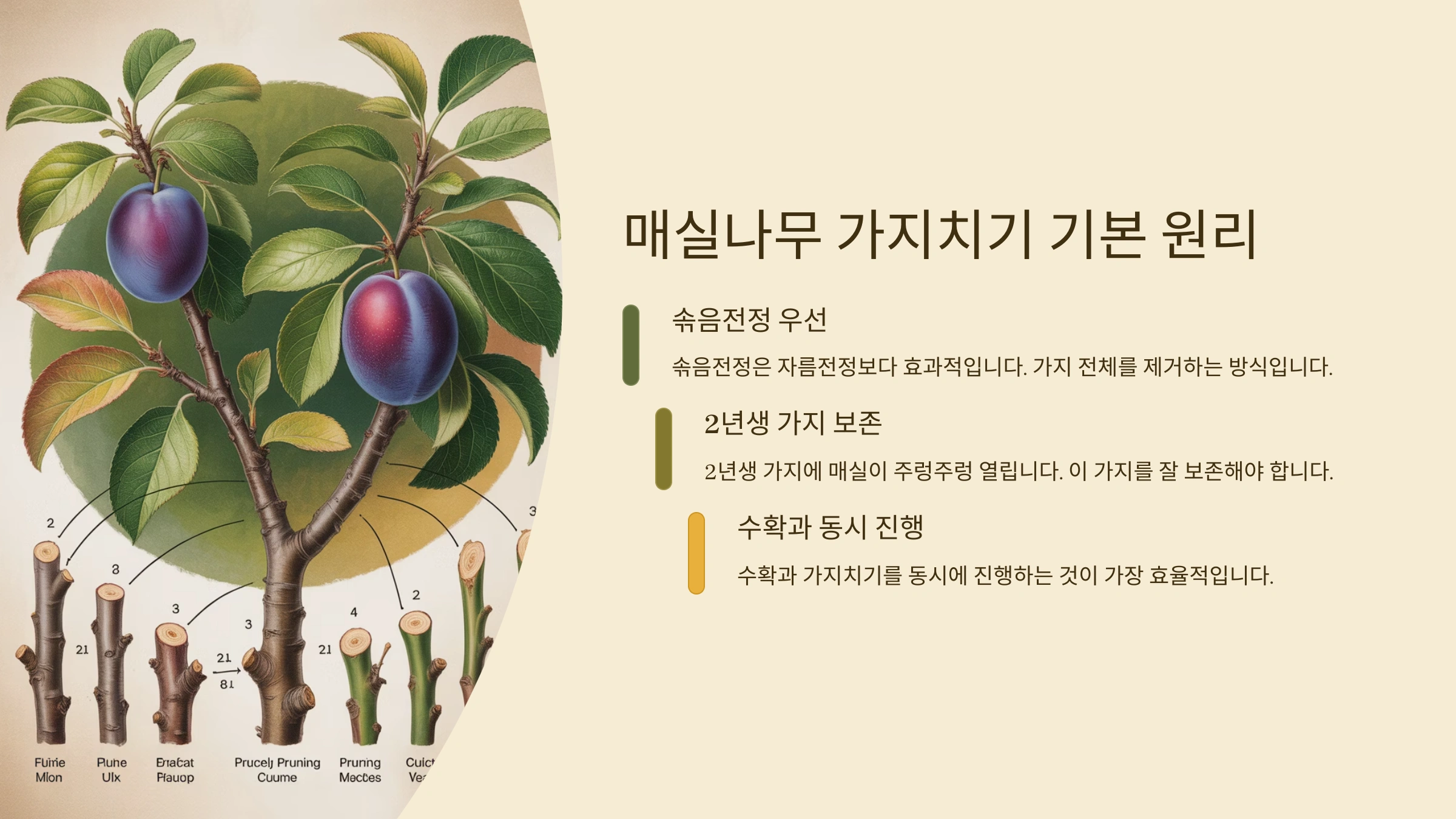 매실을 잘 수확하는 것만큼 중요한 것이 바로 매실나무 가지치기예요. 가지치기를 제대로 해주면 나무가 더 튼튼해지고, 다음 해에 더 많은 열매를 맺을 수 있답니다!