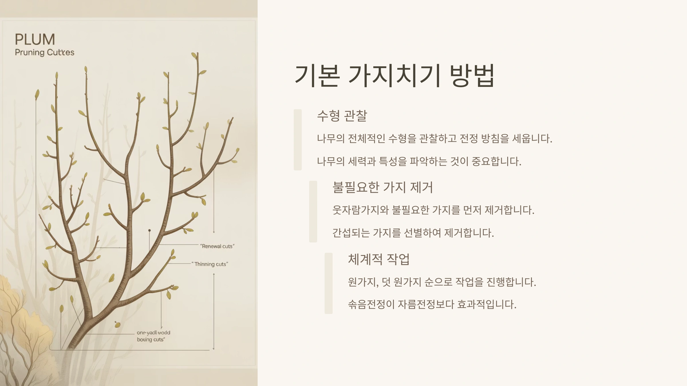 - 나무 건강: 통풍과 채광을 좋게 하여 병해충 발생을 줄이고 나무를 건강하게 유지합니다.