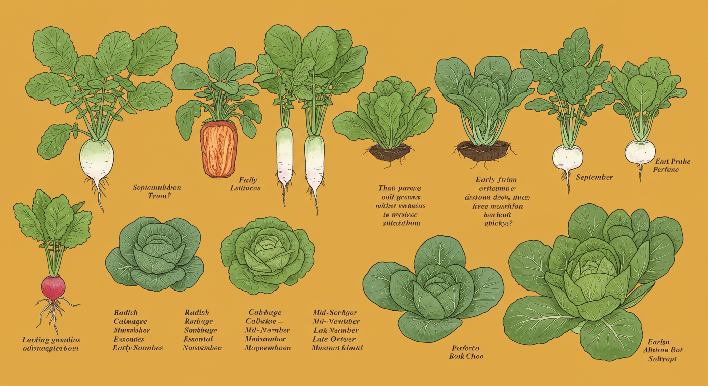 - 9월 초: 김장채소(무, 배추, 갓), 빠른 잎채소