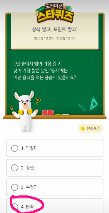 | H.Point 퀴즈 12월 22일 정답 확인 꿀팁, 매일 포인트 챙기는 법 (0) | 2025.12.22 |