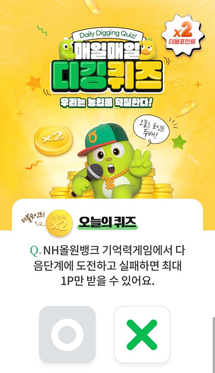 NH올원뱅크의 디깅퀴즈는 짧은 금융 상식이나 일반 상식 문제를 풀고 정답을 맞히면 NH포인트를 즉시 적립받을 수 있는 앱테크 콘텐츠입니다.